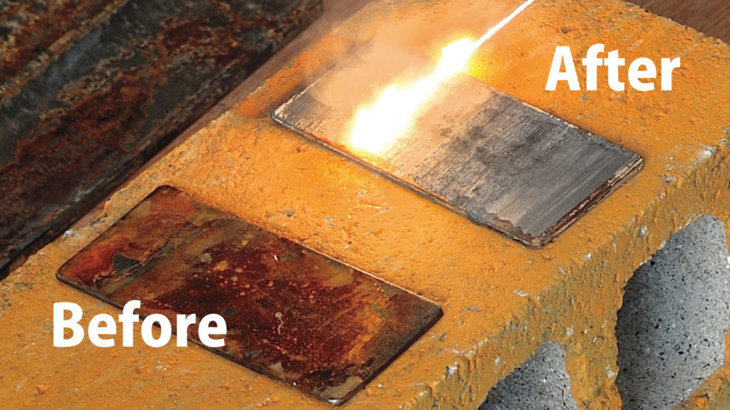 これまでのサビ除去作業は、ハンドグラインダーやワイヤーブラシを用いた手作業が中心でした。広範囲の施工には多くの時間と労力を要し、複雑な形状の部品には薬剤を使った処理が必要となるケースもありました。その結果、作業時間の長期化や細部への対応の難しさといった課題が生じていました。